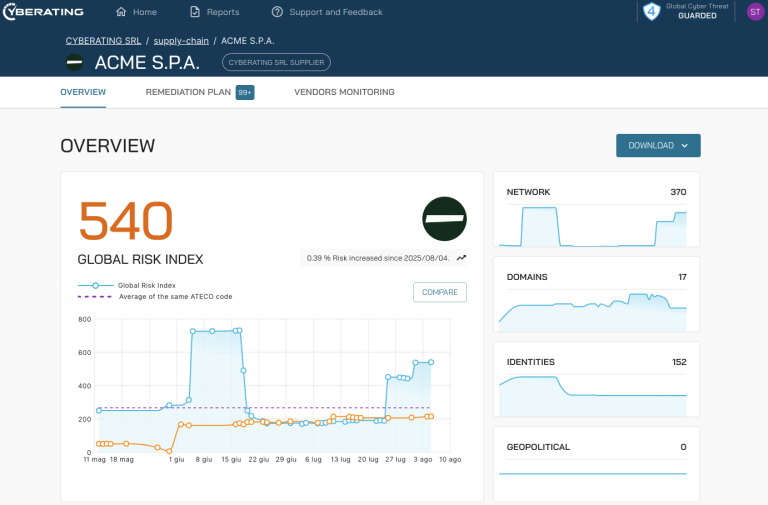 La nostra piattaforma CybeRating offre una visione completa e continua del livello di rischio informatico a cui sono esposti la tua azienda e il suo ecosistema di fornitori e partner.
